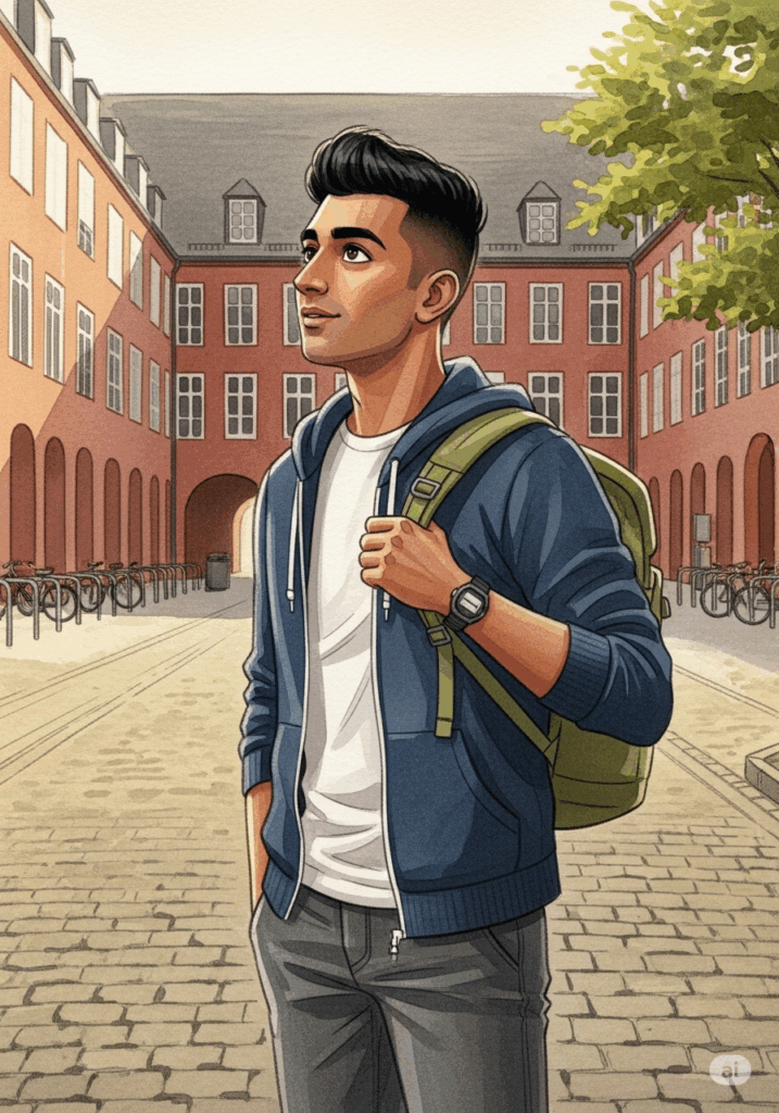 Er ist vor dem Studentendorf. Es ist 13:55 Uhr. Er hat einen Termin mit dem Hausmeister um 14:00 Uhr. Arjun wartet. Er möchte pünktlich sein.