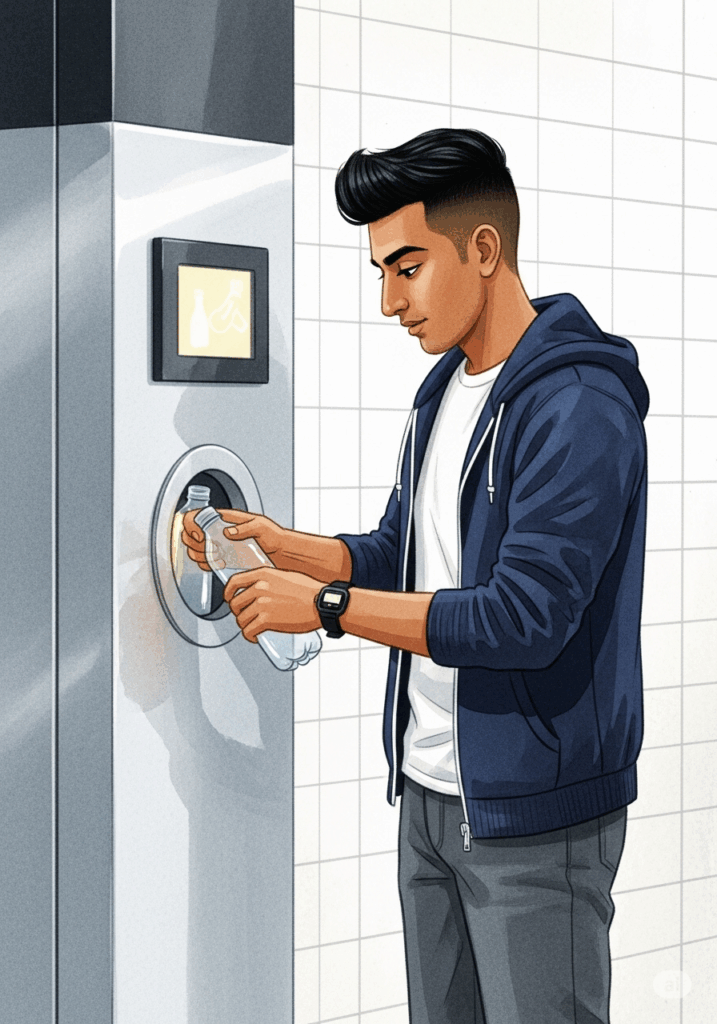 Arjun goes to the supermarket. He has empty plastic bottles in a bag. He looks for the bottle return machine. He puts the bottles into the machine. The machine makes noises.