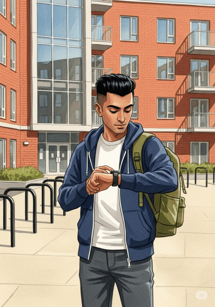 He is in front of the student village. It is 1:55 PM. He has an appointment with the caretaker at 2:00 PM. Arjun waits. He wants to be on time.
