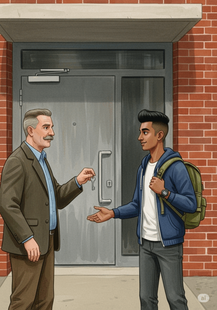 Herr Schmidt ist der Hausmeister. Er kommt genau um 14:00 Uhr. Er sagt: „Guten Tag! Sie sind pünktlich. Das ist sehr gut.“ Herr Schmidt gibt Arjun den Schlüssel für sein Zimmer.