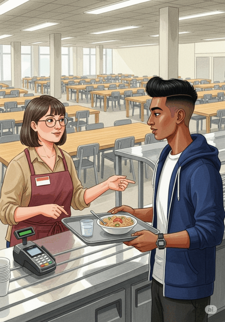 Arjun is hungry. He goes to the university canteen. He sees the menu. Today there is pasta. He speaks with Ms. Müller at the register. He needs his student card.