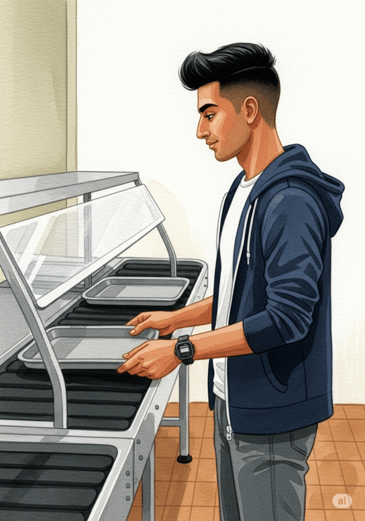Arjun eats the pasta. The food is delicious. Then he stands up. He takes the tray to the tray return station. He leaves his place clean. That is important in the Mensa.