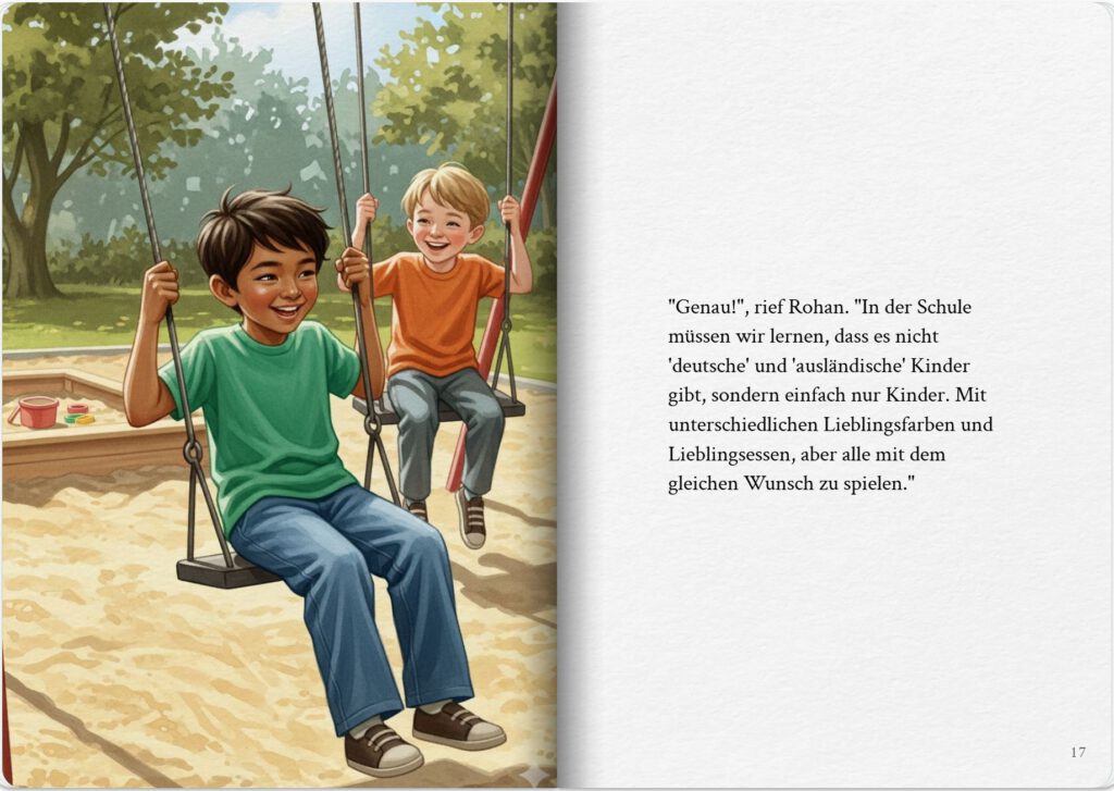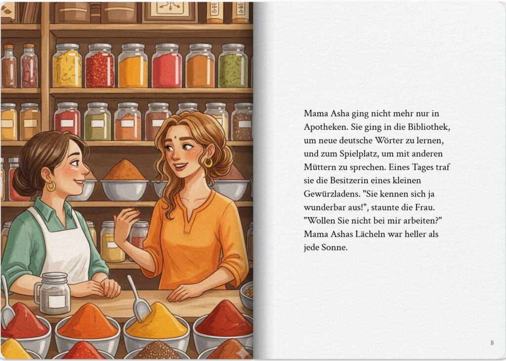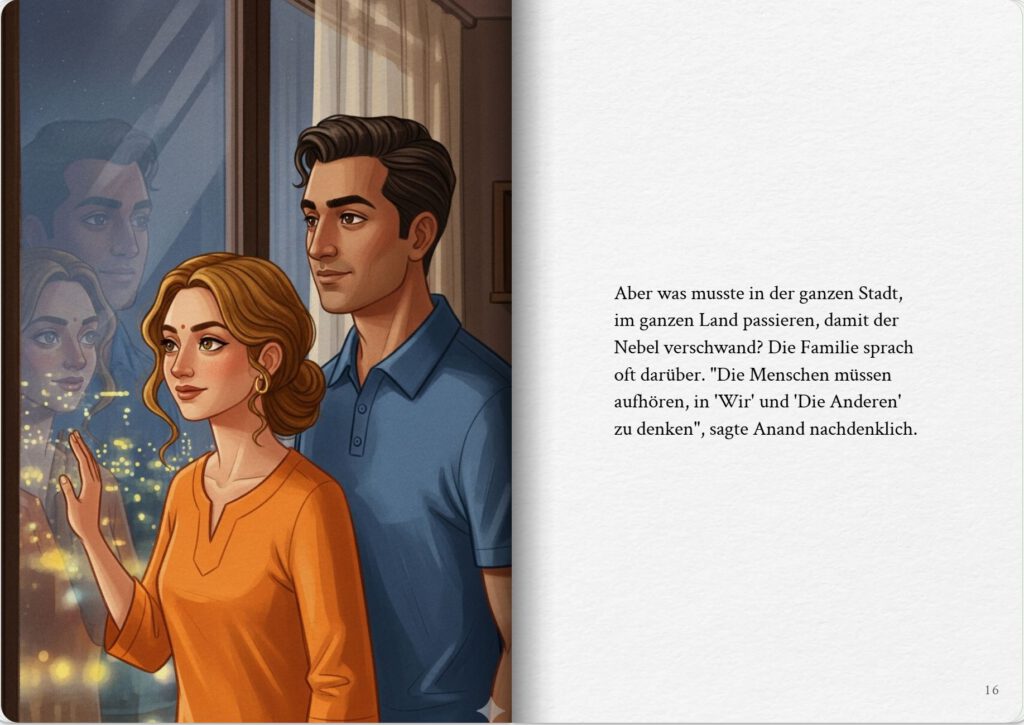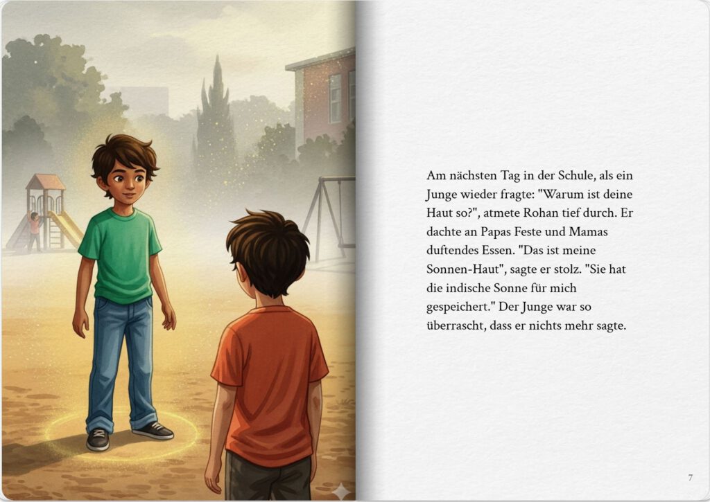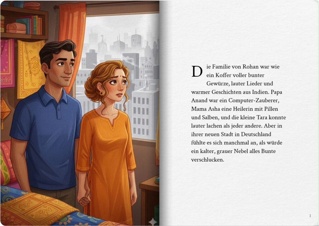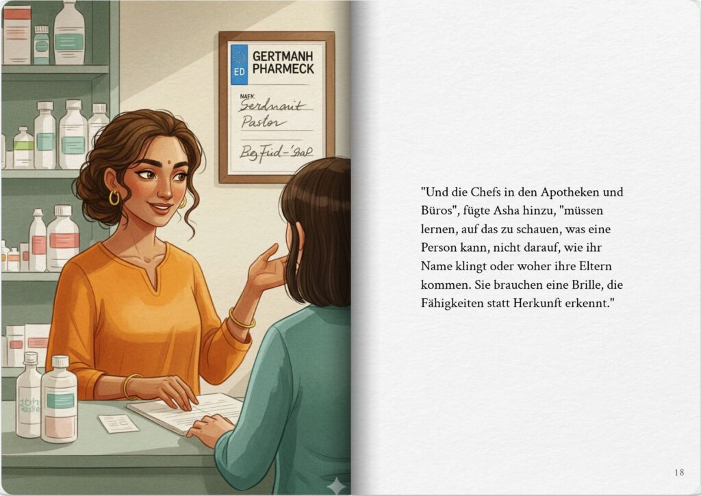 Eine Geschichte über eine junge Familie aus Indien, die nach Deutschland gezogen ist. Die Geschichte richtet sich an Kinder im Grundschulalter und soll ihnen und ihren Eltern Strategien an die Hand geben, wie sie mit Diskriminierung umgehen und sich in ihrer neuen Heimat wohlfühlen können.