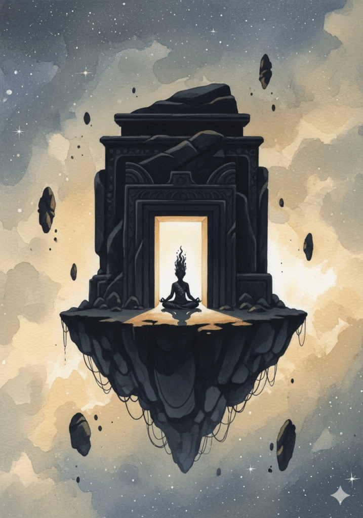 In seiner Vision sah er einen aus schwarzem Fels gehauenen Tempel, der im Kosmos schwebte. An seinem Eingang saß eine dunkelhäutige Gestalt in vollkommener Stille. Es war kein Gott, den er aus irgendeinem Buch kannte. Es war etwas Neues, etwas Ganzes.