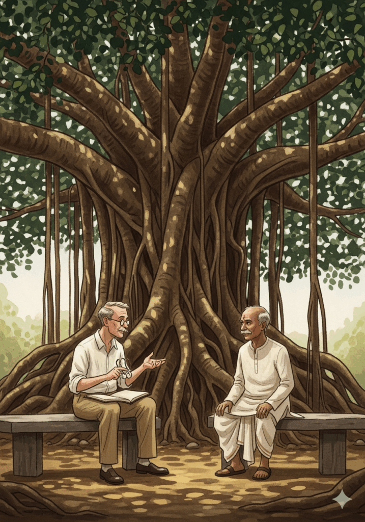 Er traf einen weisen Philosophen namens Iyer. Sie saßen unter einem großen Banyanbaum und unterhielten sich stundenlang, nicht über Götter, sondern über das „Ich“ in jedem Menschen. „Das ‚Ich‘ ist eine Geschichte, die wir uns selbst erzählen“, sagte Iyer mit einem Lächeln. „Eine nützliche Geschichte, aber dennoch eine Geschichte.“