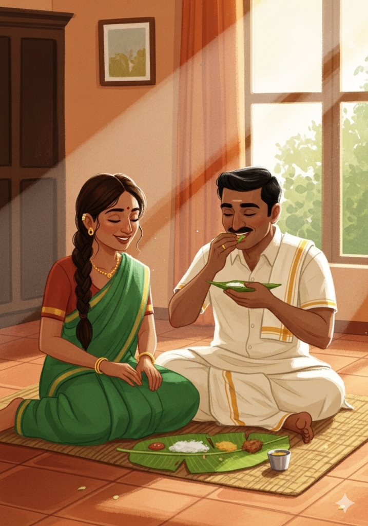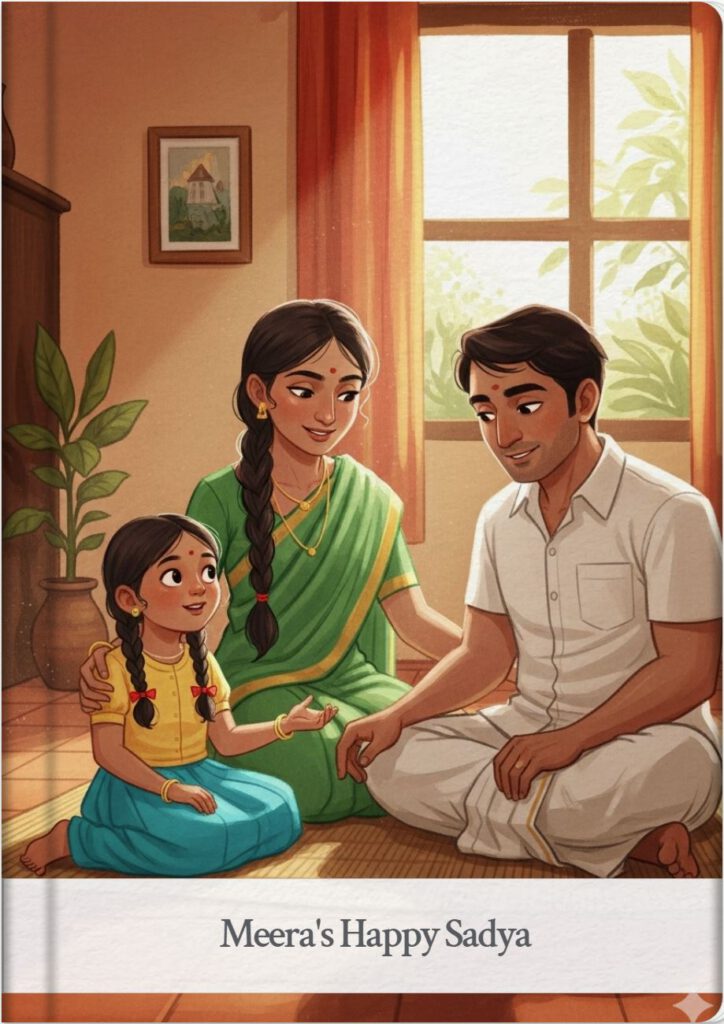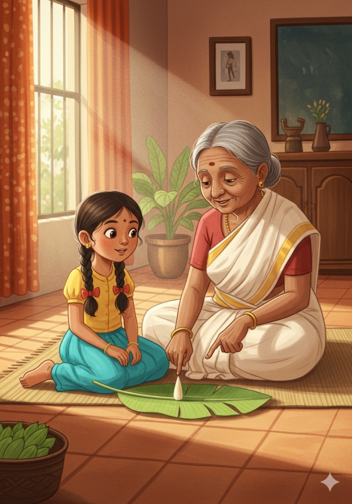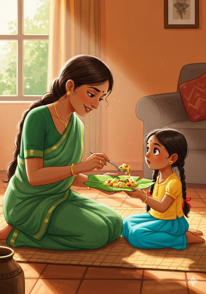 Soon, it was time to eat! The whole family sat down on the mat. Ammachi took a leaf and placed it in front of Meera.