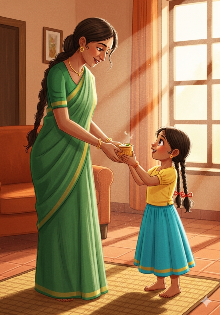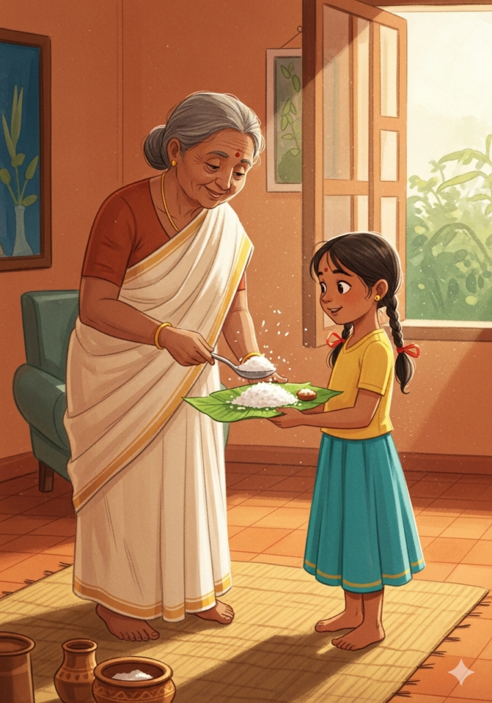 Just when Meera thought her tummy was full, Amma brought out small cups. “Payasam!” she announced.